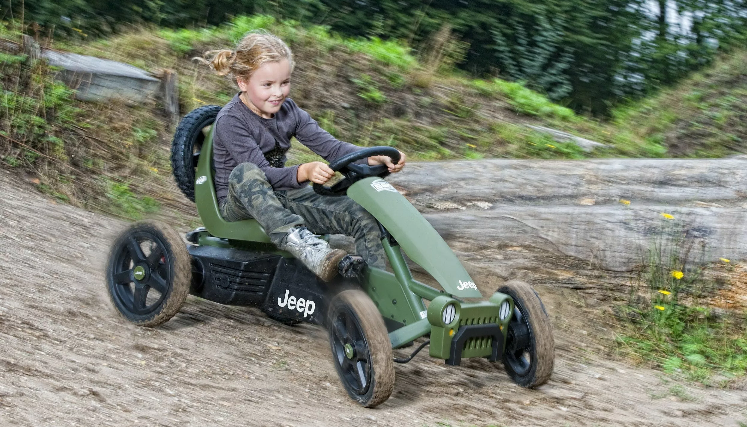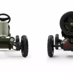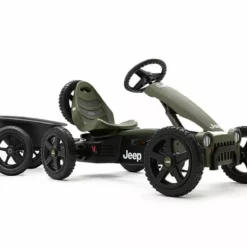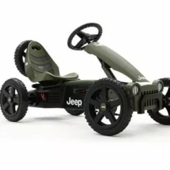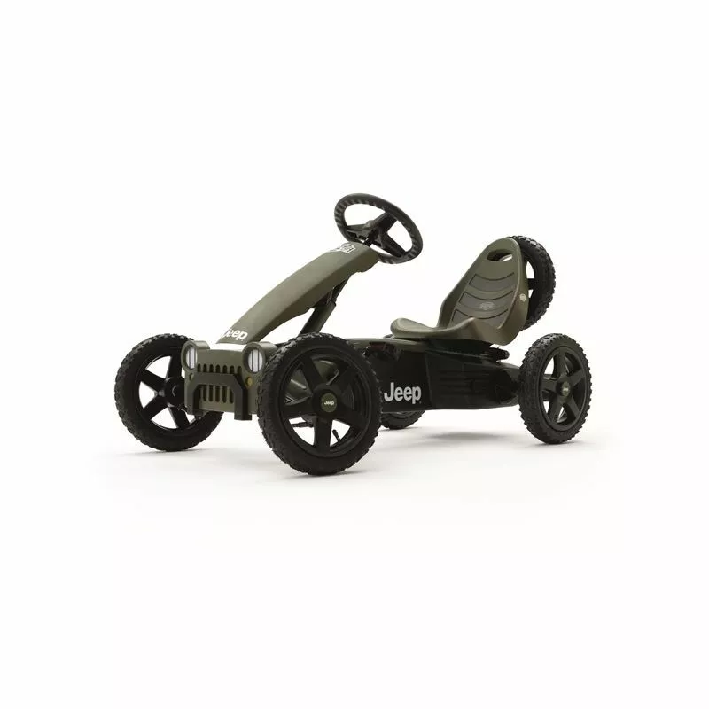 El coche de pedales Berg Jeep Adventure es un auténtico todoterreno de la mítica y legendaria marca de 4×4. Sus neumáticos de tacos permitirán que los niños se diviertan en zonas de tierra y barro sin problemas. Este kart de pedales, además incorpora una rueda de repuesto detrás dela siento del conductor. El exclusivo sistema BFR desarrollado por Berg Toys permite frenar a contrapedal (girando los pedales hacia atrás) con total seguridad. Este modelo también tiene una palanca que bloquea las ruedas, y así poder aparcar el kart de forma segura en cualquier lugar.